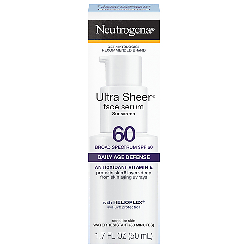 Enjoy a full day in the sun while protecting and moisturizing your skin with Neutrogena Ultra Sheer SPF 60 Face Serum. This soft, weightless facial sunscreen with vitamin E defends your skin by providing all-day hydration, plus broad-spectrum UVA and UVB protection. The sheer sunscreen serum from a dermatologist-recommended brand leaves skin feeling soft and smooth--and serves double duty as a makeup primer. It's water-resistant for up to 80 minutes, and the fragrance-free formula is both oxybenzone-free and non-comedogenic. In addition to preventing sunburn, when used as directed with other sun-protection methods, Neutrogena Ultra Sheer Face Serum sunscreen decreases the risk of skin cancer and early skin aging caused by the sun. Apply liberally 15 minutes before sun exposure, and reapply after 80 minutes of swimming or sweating, immediately after towel-drying, and at least every two hours. For children under 6 months of age, ask their doctor about sunscreen use.