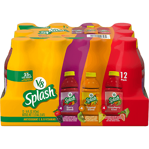 Quench your thirst with the refreshing taste of V8 Splash® Berry Blend, Tropical Blend and Strawberry Kiwi Flavored Juice Beverages. Each 5% juice blend is made from the concentrated juices of vegetables with the natural flavors of fruit for a tasty drink with a satisfying splash of delicious fruit flavor. V8 Splash® juice beverage contains 25% less sugar than leading juice drink brands,* plus Antioxidant C and B Vitamins. It’s also gluten free and fat free. With only 80 calories per serving, V8 Splash® is a lower calorie alternative to orange juice and apple juice. Serve this fruit flavored drink in the morning or as part of an after-school snack. V8 Splash® is also delicious in homemade smoothies and makes a great mocktail or cocktail mixer. (*Per 16 fl oz: Leading shelf stable brands, 26g; Splash, 18g)