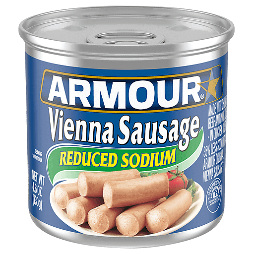 Armour Star Vienna Sausage, Reduced Sodium, is made with chicken, beef and pork added and is bursting with a delicious flavor. This sausage is made with 35% less sodium than Armour Original Vienna Sausage* and can be eaten right out of the can, so you can enjoy this canned meat on the go, as an easy snack in your pantry or as survival food in your emergency disaster kit. Do parties, camping and game days right; serve up Armour Star Original Vienna Sausage as a snack or appetizer. Make any time Armour Star time!