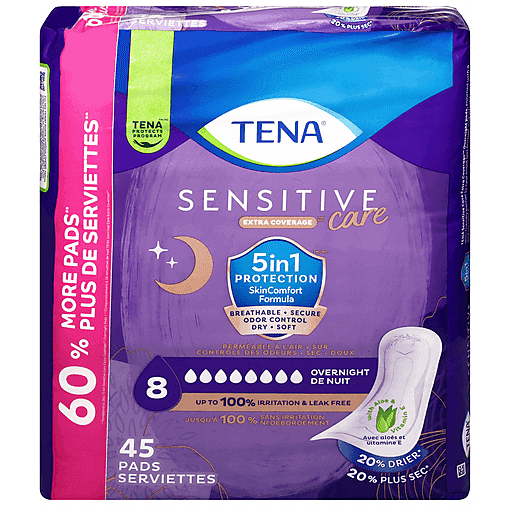 TENA, trusted by millions of women worldwide, continues to keep your intimate skin a priority. TENA Sensitive Care Extra Coverage Overnight Incontinence Pads now with a 20% drier surface. Up to 100% irritation and leak free; with lie down protection and 20% extra coverage. TENA has the first ever bladder weakness pads enriched with our 5 in 1 SkinComfort Formula- our skin friendly barrier in combination with our soft and 100% breathable materials, help protect intimate skin, while our odor control and Dry-Fast Core offer intimate skin dryness and security. Now with Vitamin E & Aloe. TENA Sensitive Care Extra Coverage Overnight pads are for worry free nights, designed for overnight use and for women experiencing postpartum incontinence. TENA, the world's leading incontinence brand.
